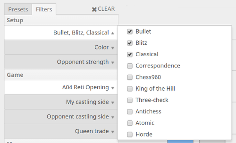 It indexes your games with as much detail as possible: move times, game phase detection (opening, middlegame, endgame), material imbalances, rating gain, and more. Computer analysed games also provide data such as average centipawn loss, opportunity and luck, which will be described shortly.