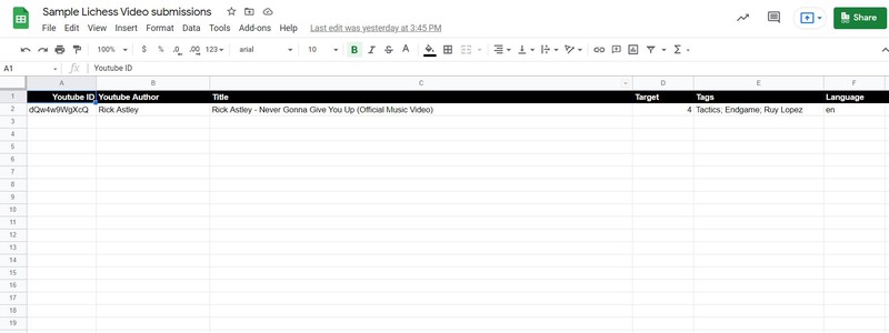 Videos should be submitted in the same format that Lichess uses them. Make a spreadsheet with google docs and post the link in the discord for review and approval. You will have to set the sharing settings to allow others to view your spreadsheet.
